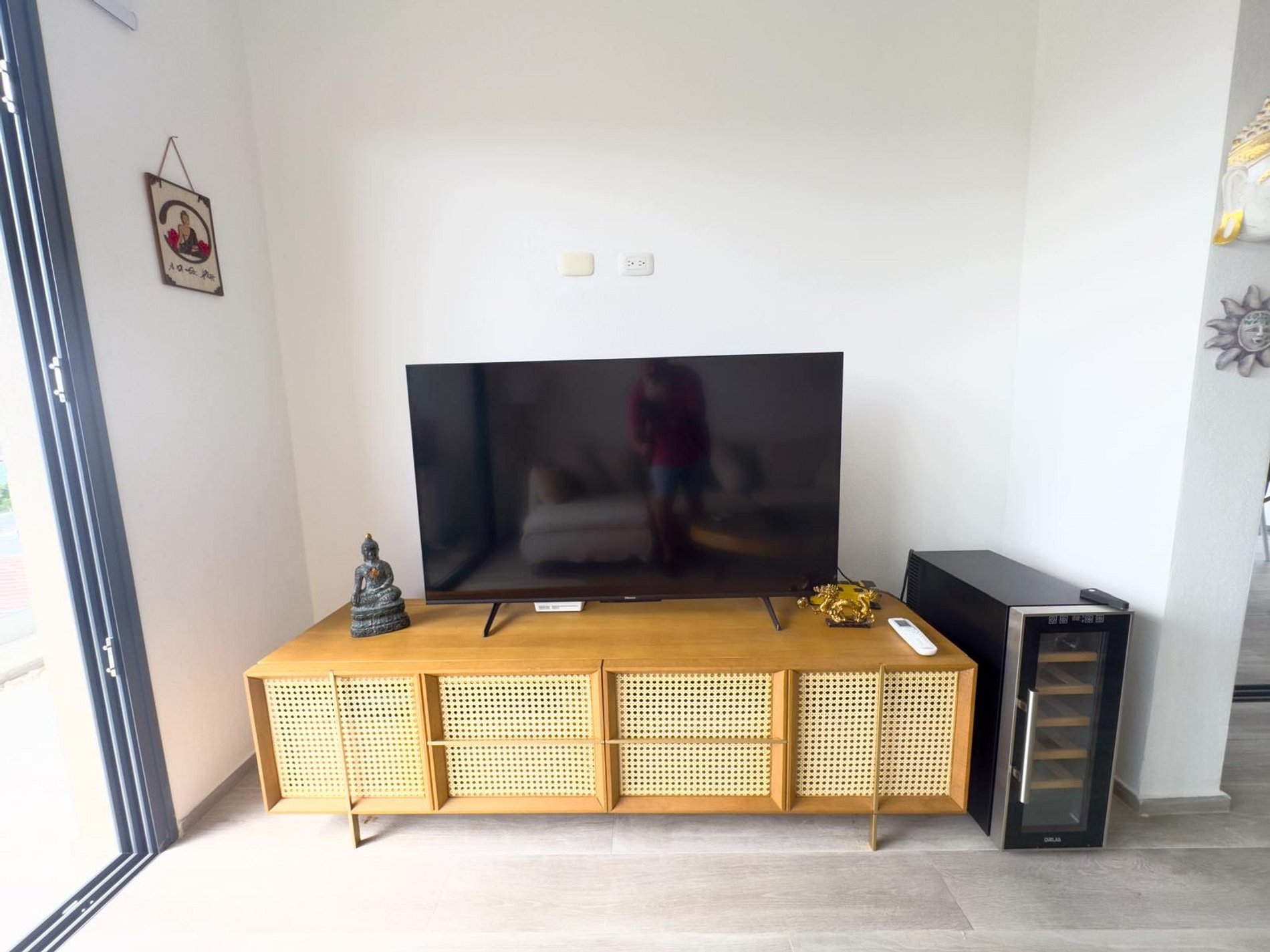 Espacios amplios: sala de estar, comedor, cocina completamente equipada, dormitorios con aire acondicionado.