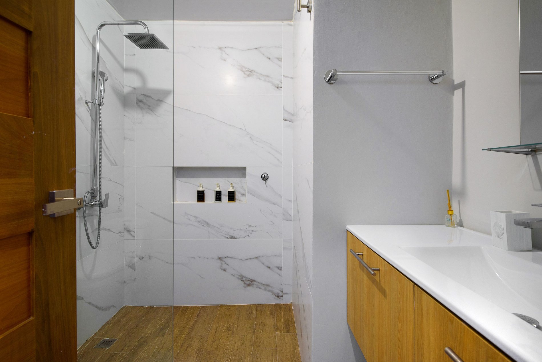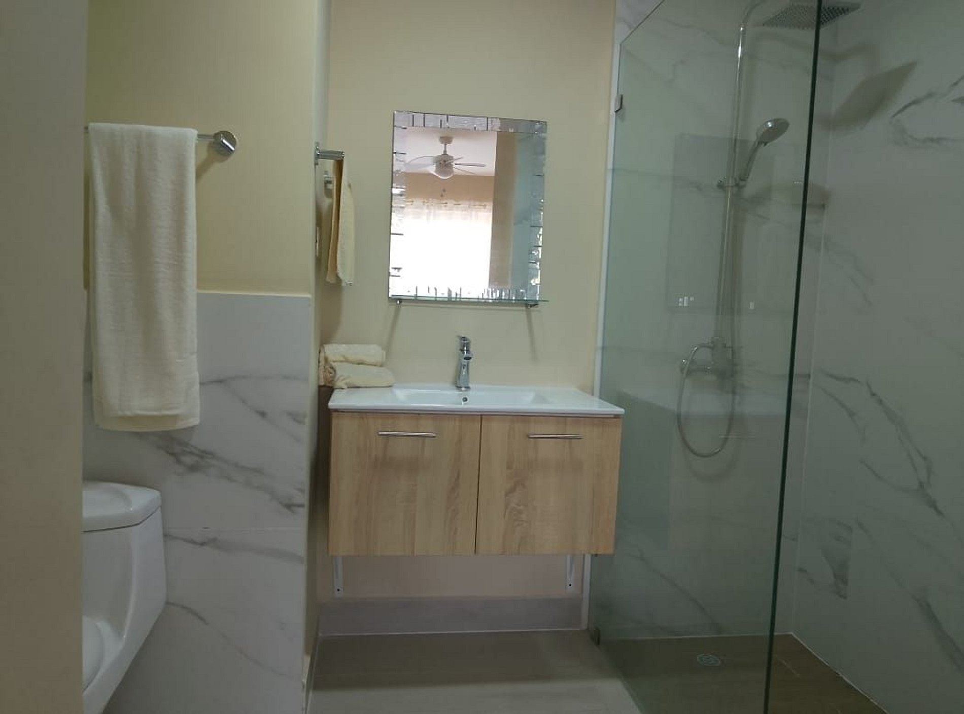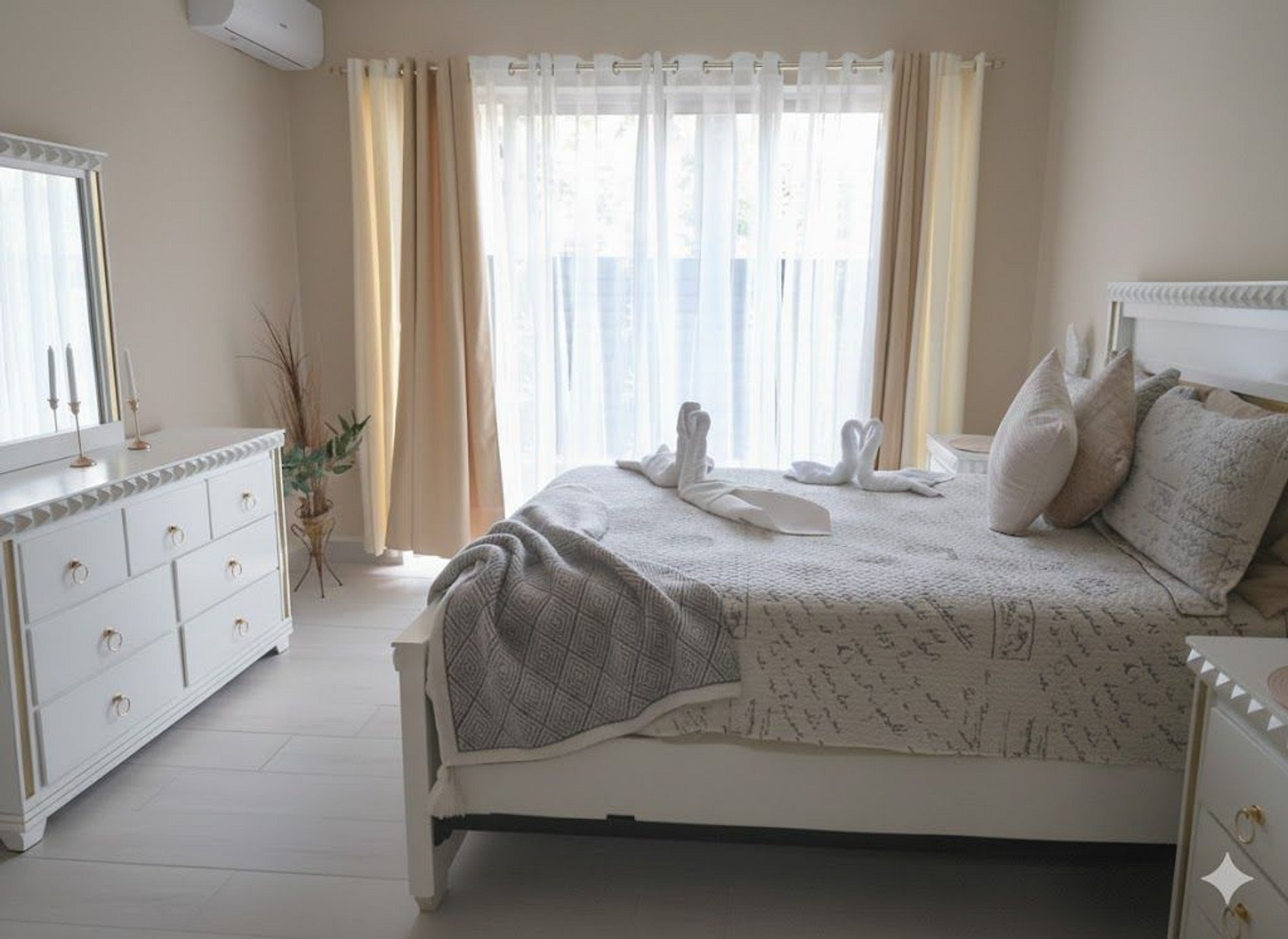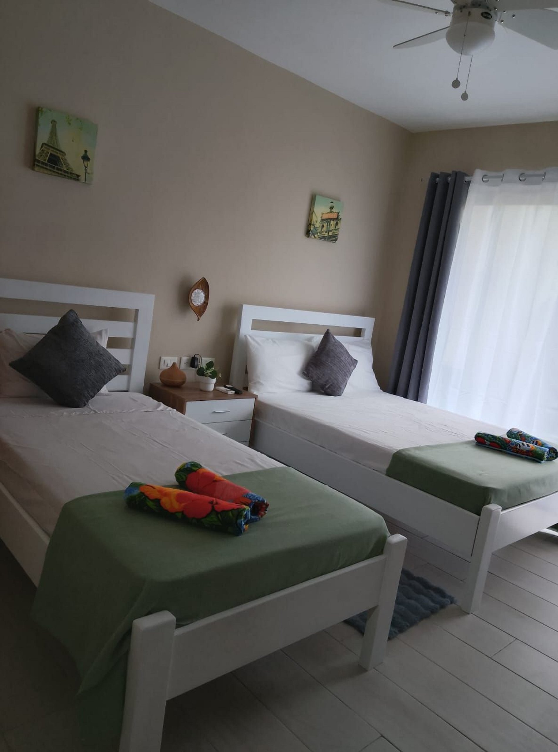 DORMITORIO 1 El dormitorio 1 tiene una acogedora cama Queen, un ventilador de techo, aire acondicionado y un baño privado con ducha a ras de suelo.