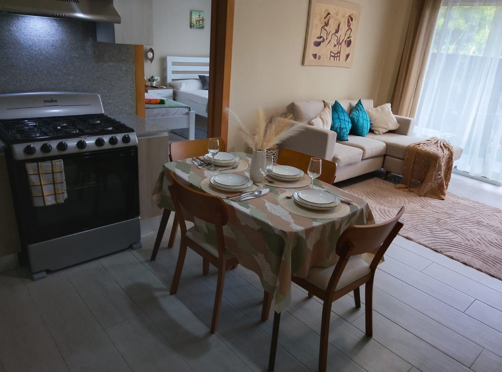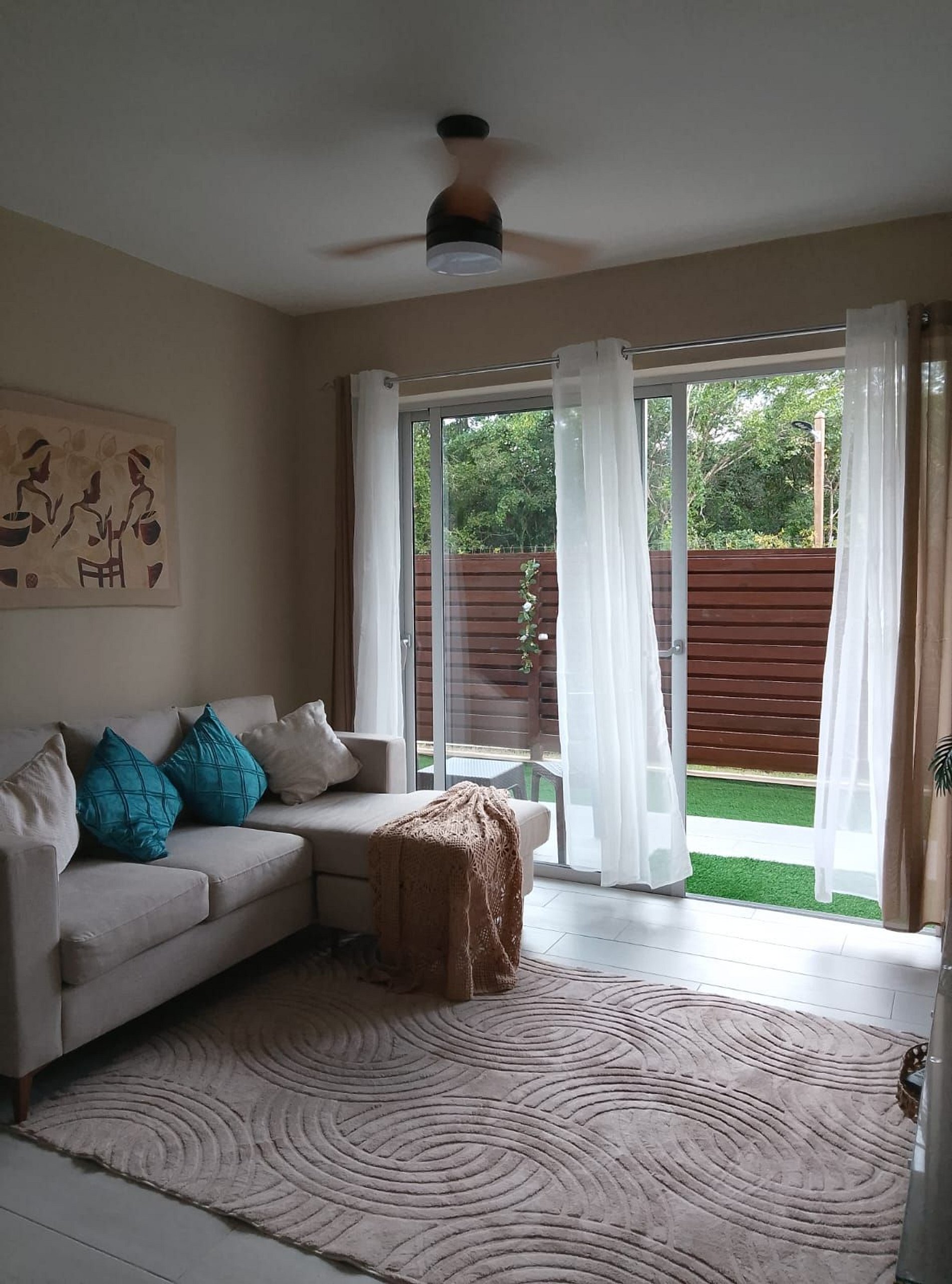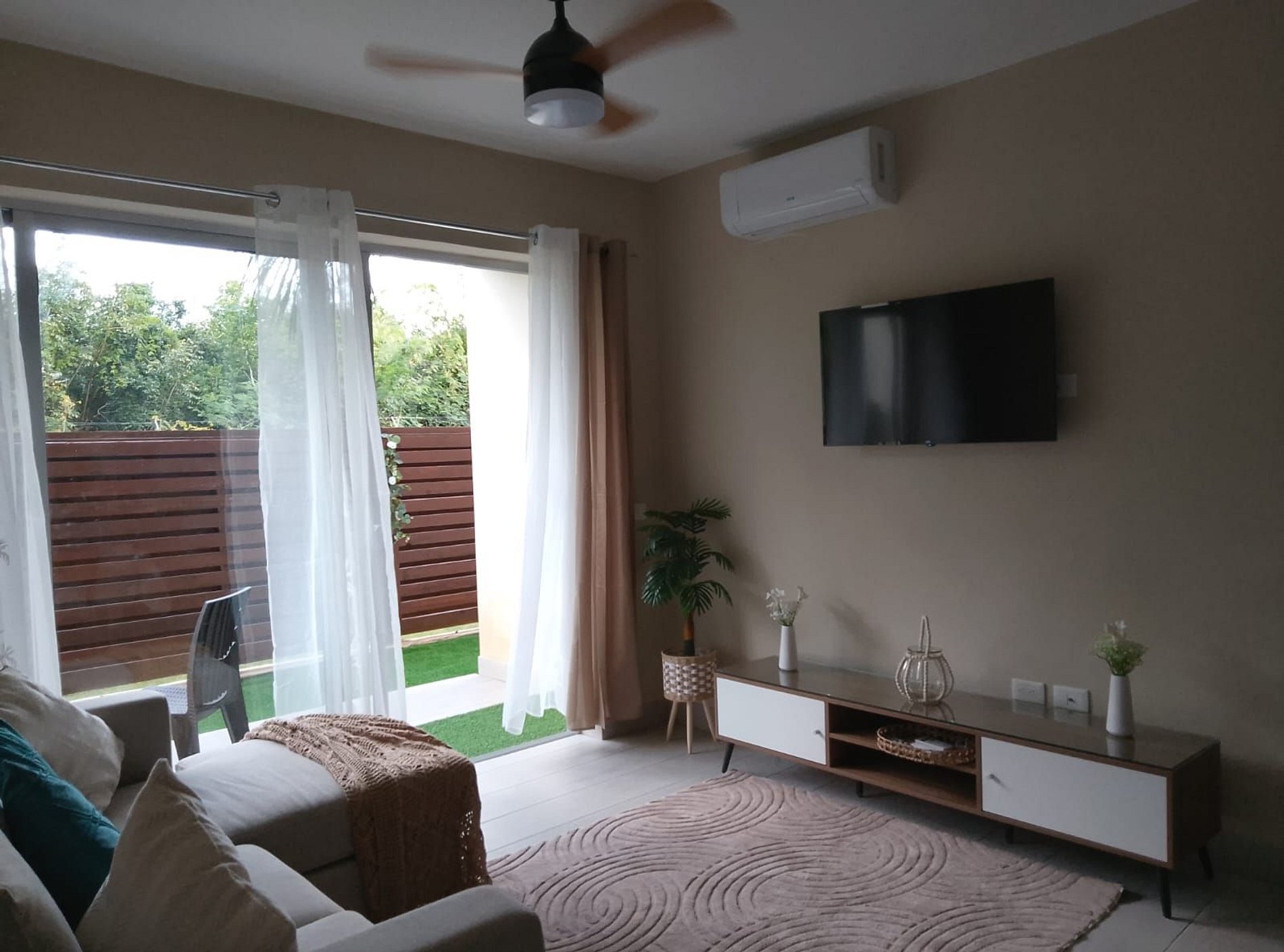 SALA DE ESTAR: La sala de estar cuenta con un cómodo sofá, un televisor inteligente y un ventilador de techo. También tiene acceso directo al balcón.