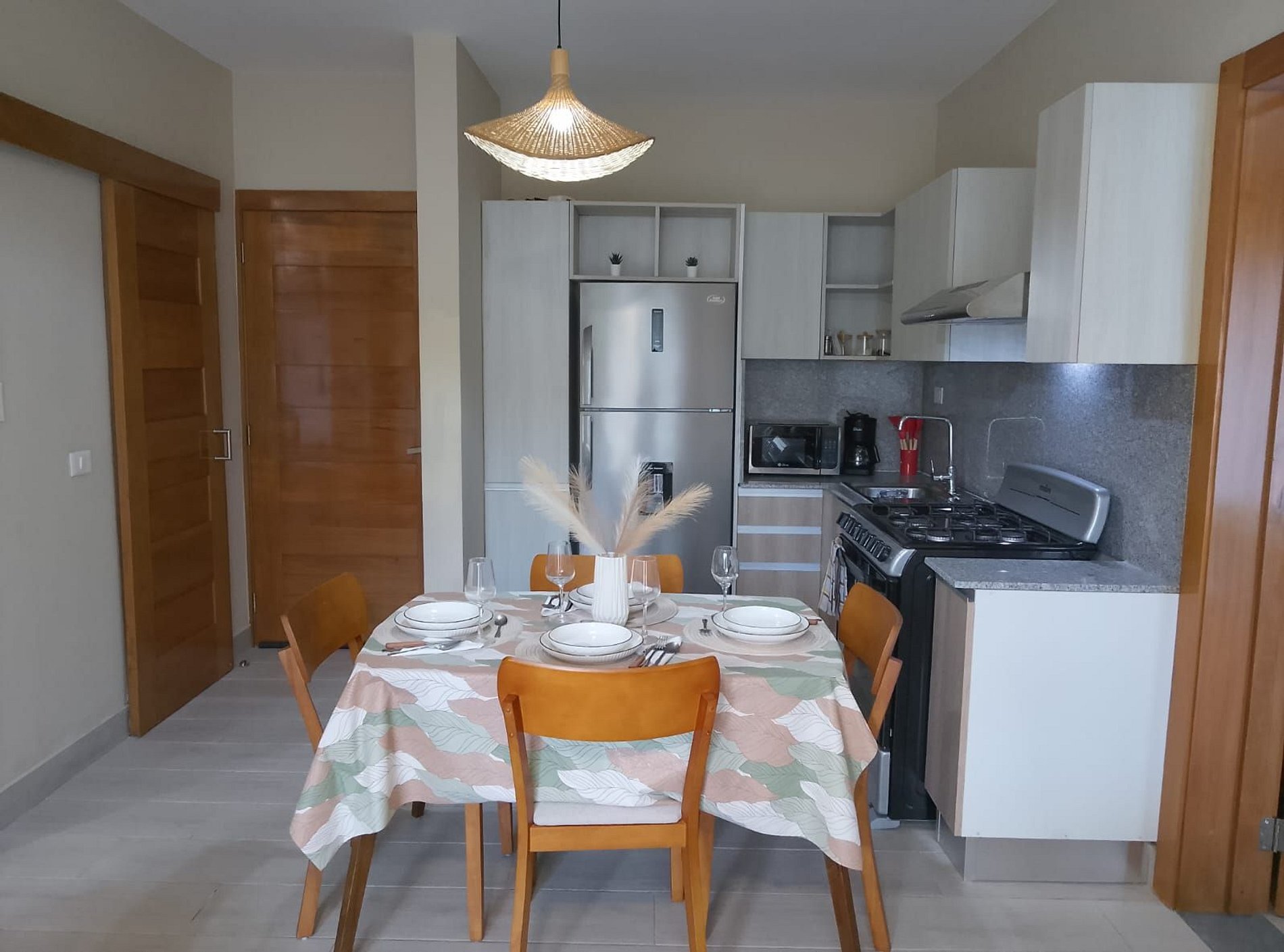 COCINA: La cocina tiene un diseño moderno y está amueblada con una amplia nevera, estufa, horno, microondas, cafetera y más.