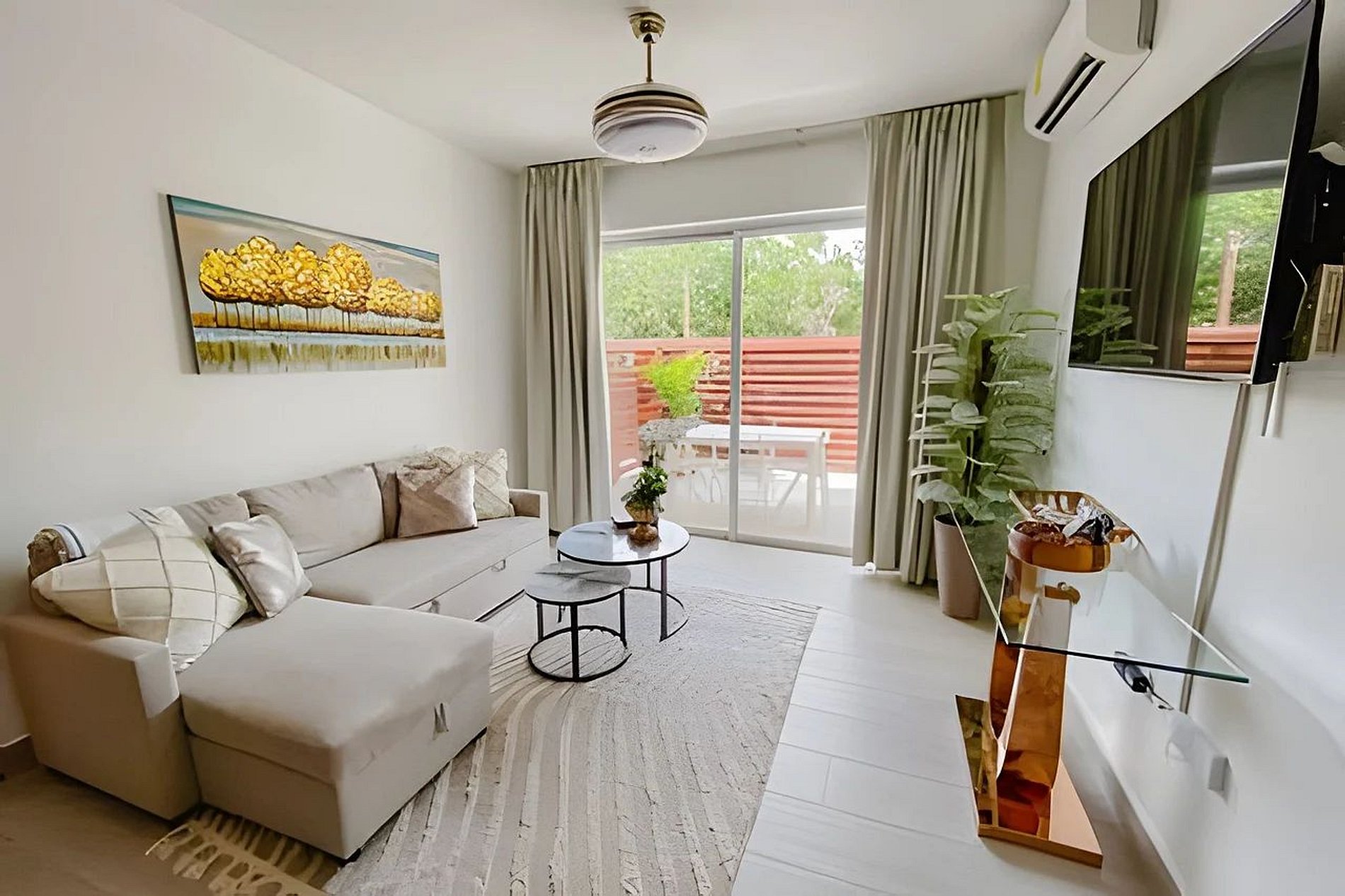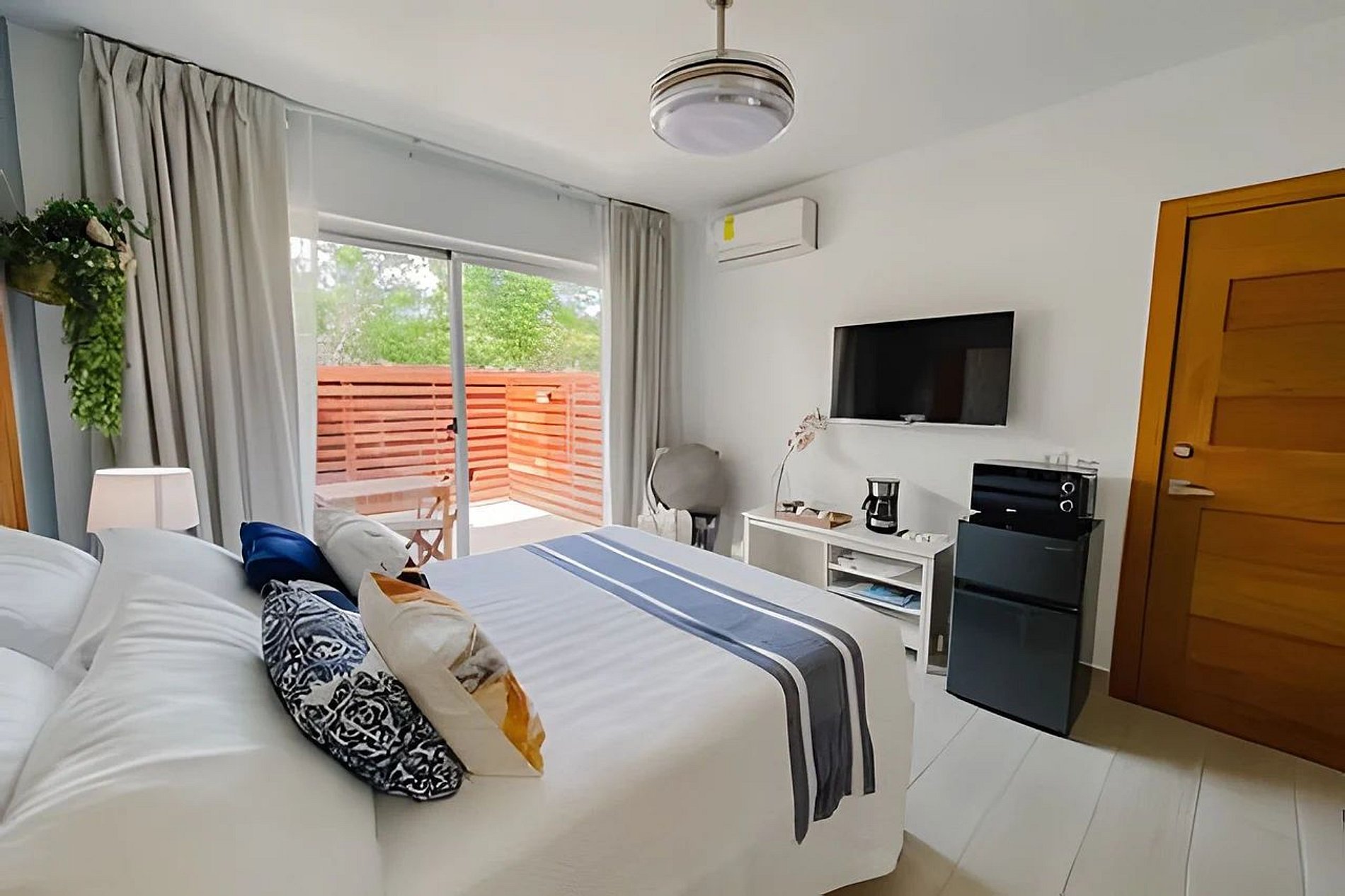 El salón cuenta con un cómodo sofá cama, smart TV, ventilador de techo y aire acondicionado. También tiene acceso directo al balcón.