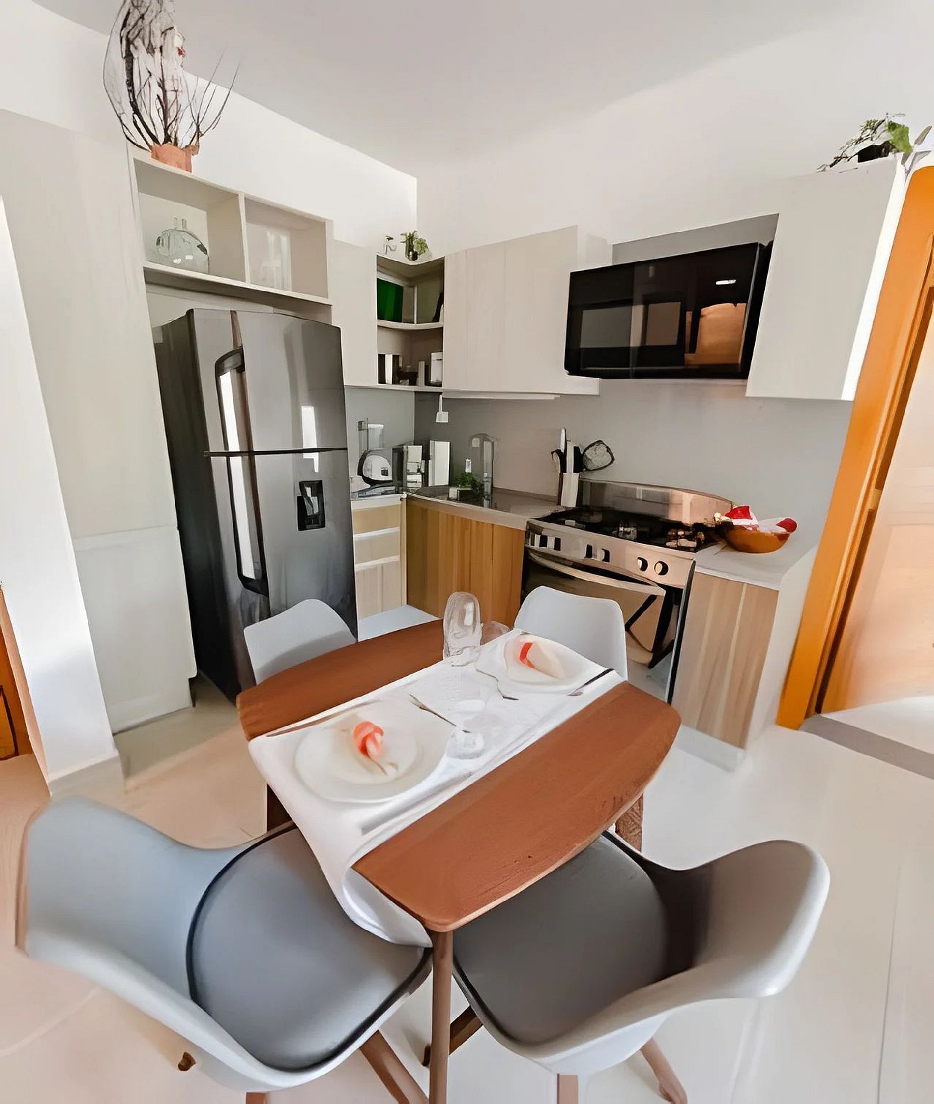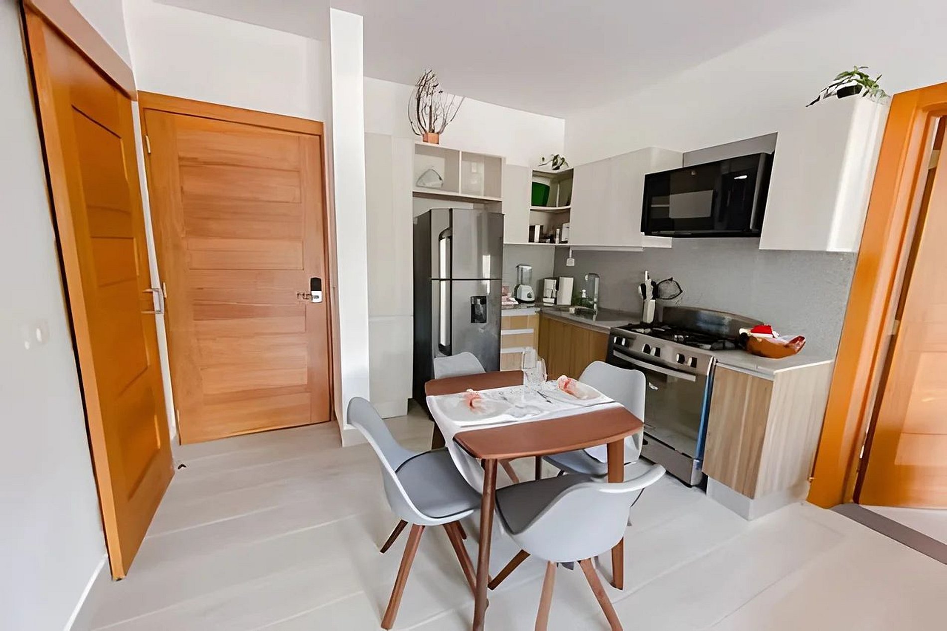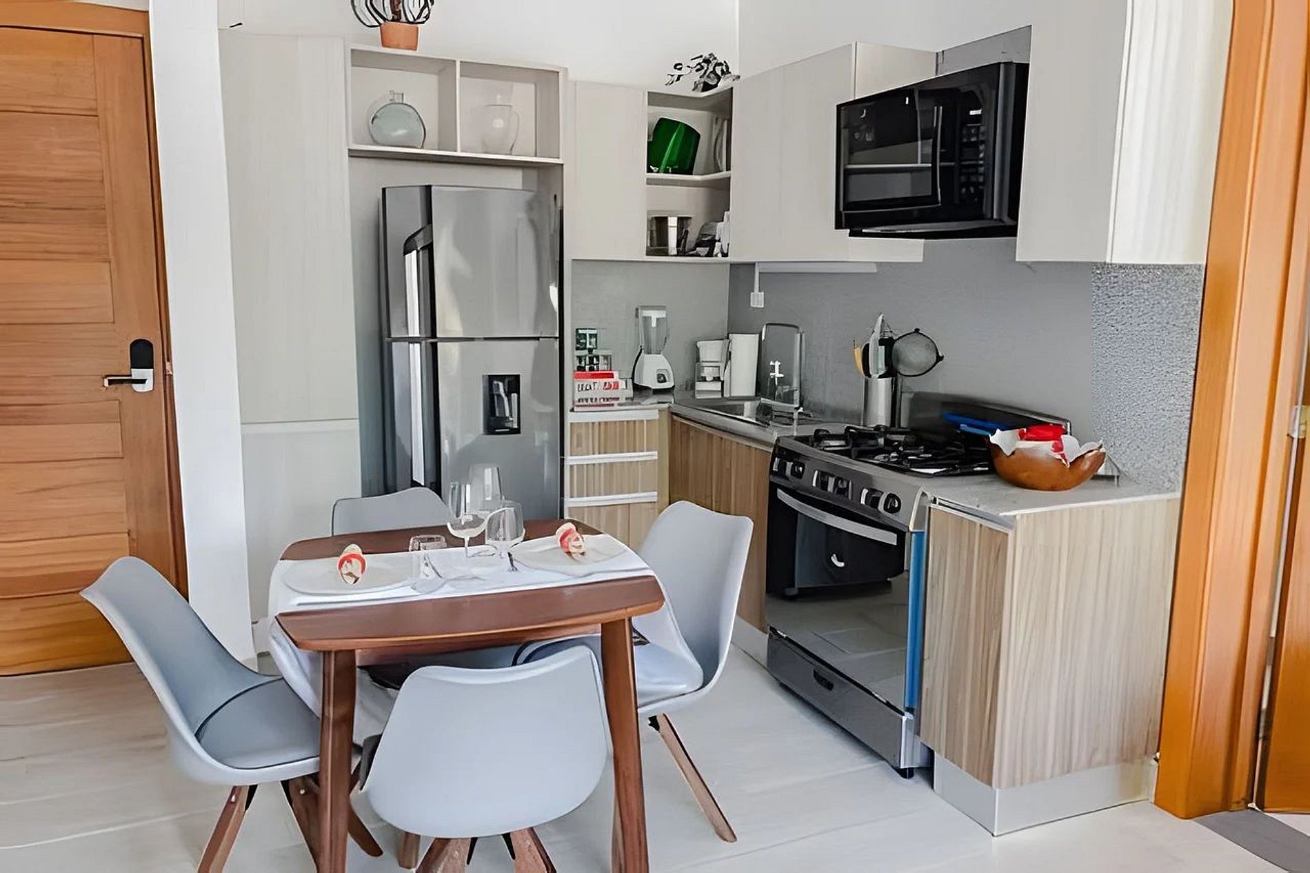 La cocina presenta un diseño moderno y está equipada con una amplia nevera, estufa, horno, microondas, cafetera y más.
