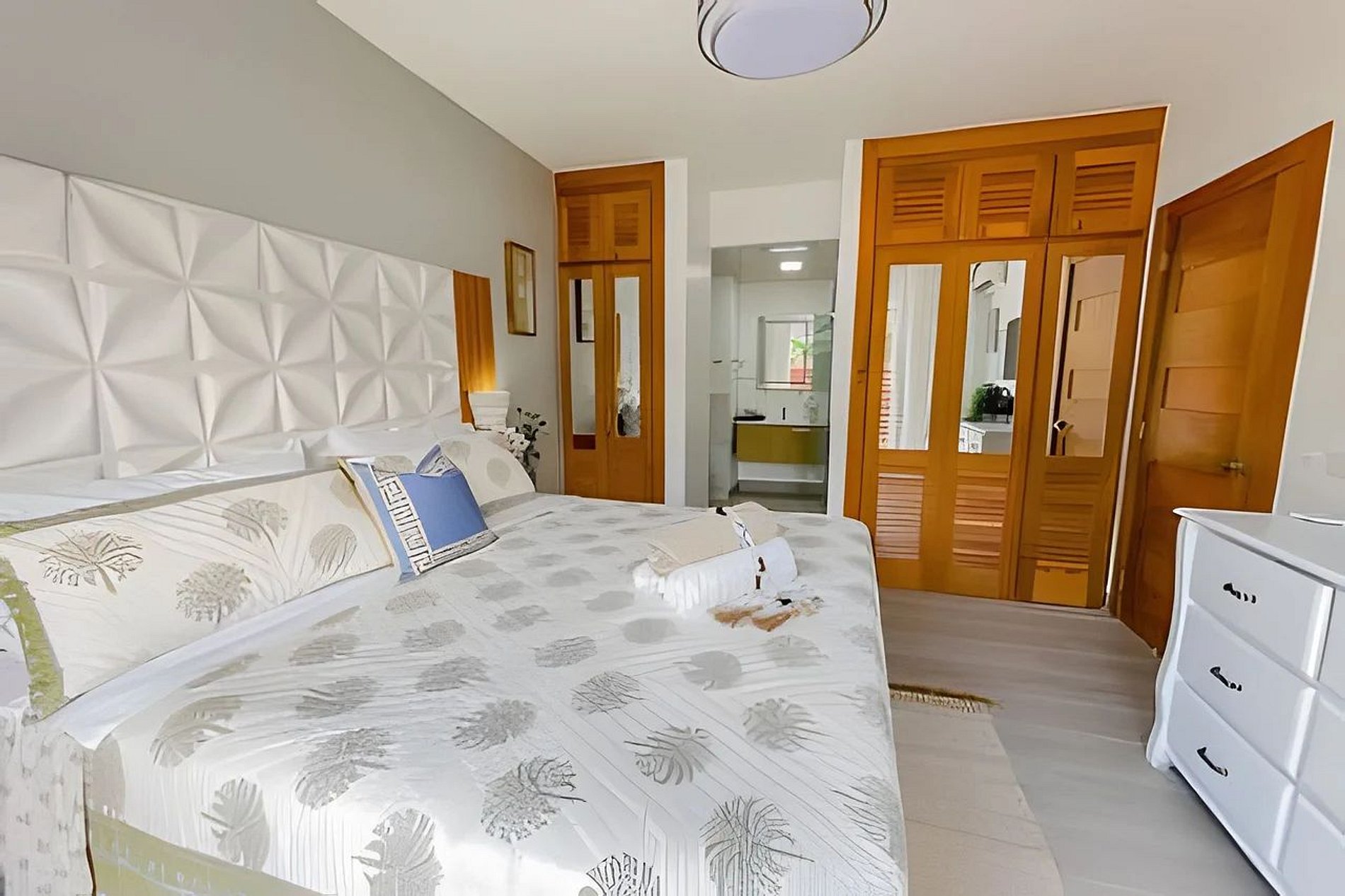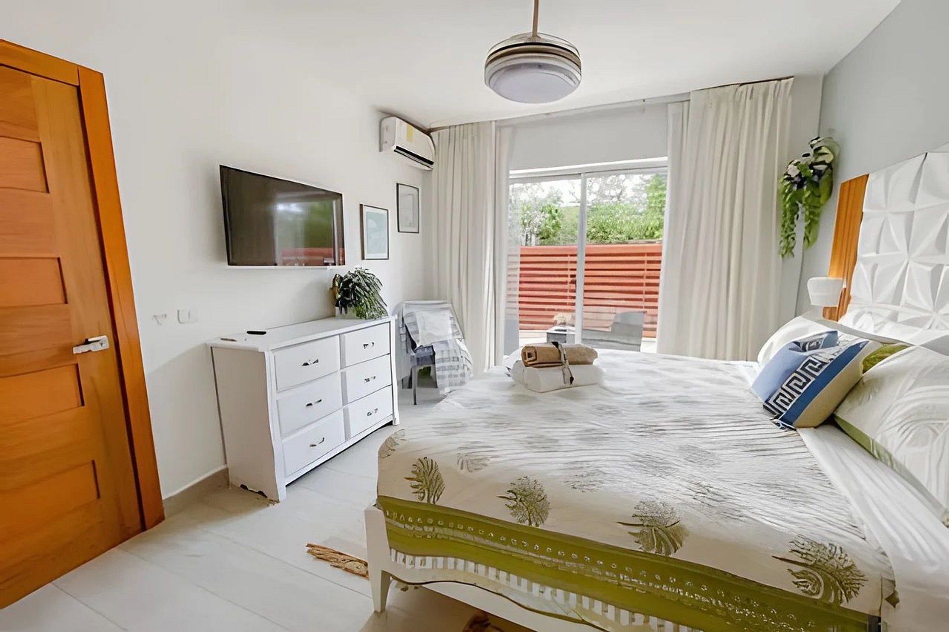 El dormitorio 1 tiene una acogedora cama King, un televisor inteligente, un ventilador de techo, aire acondicionado y un baño privado con ducha a ras de suelo.