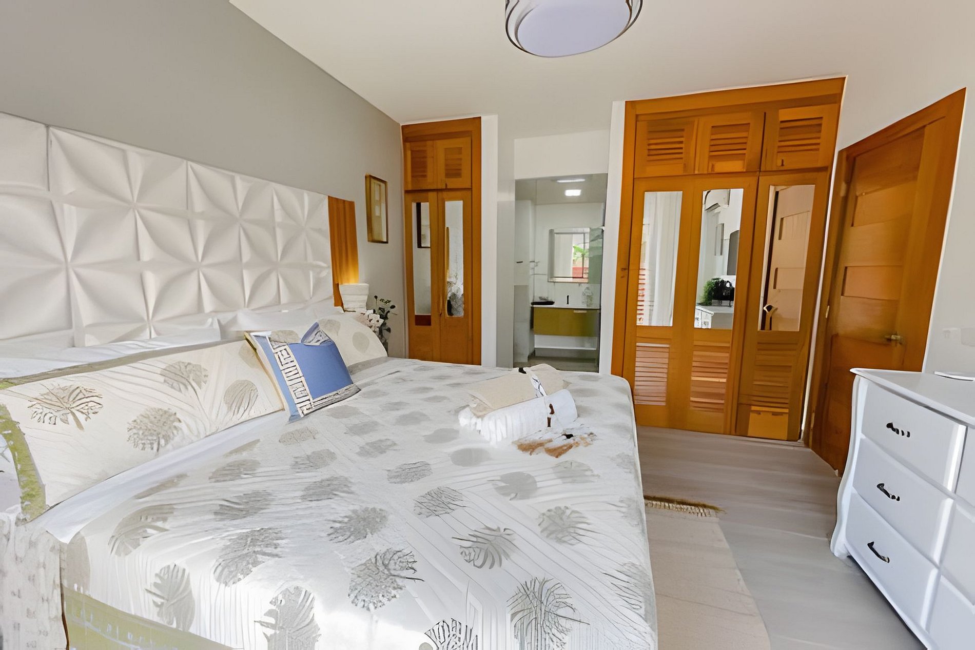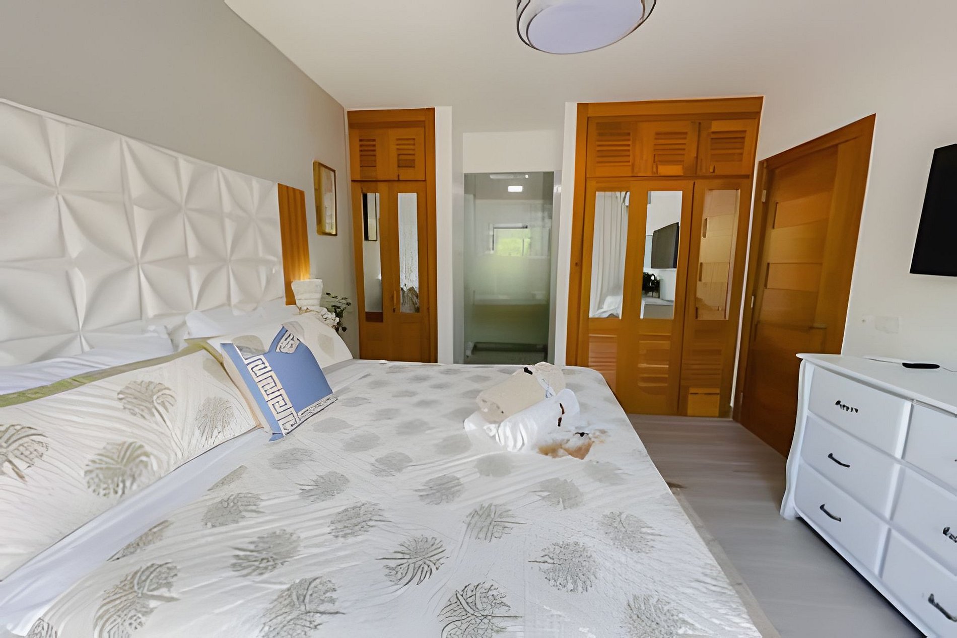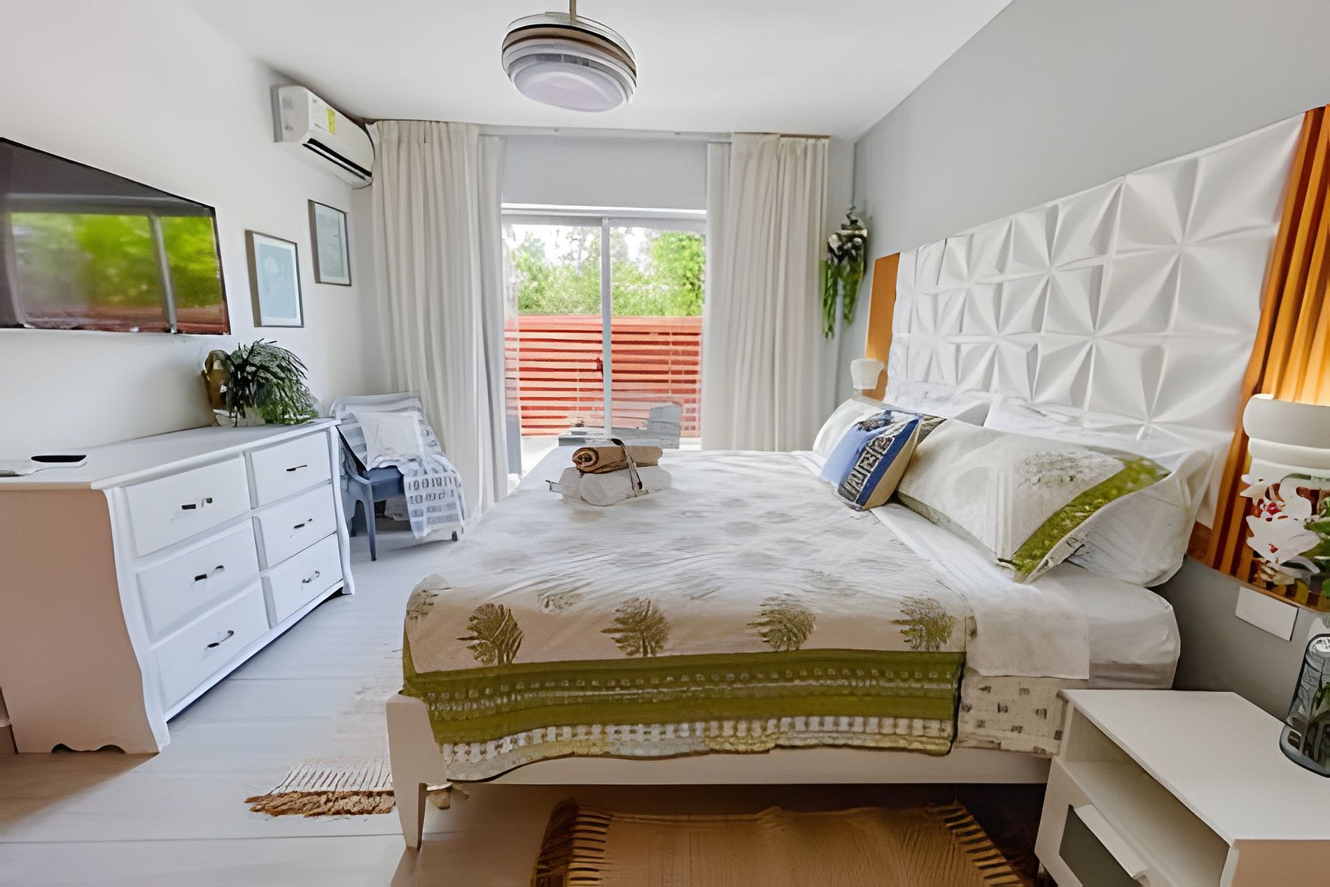 El dormitorio 1 tiene una acogedora cama King, un televisor inteligente, un ventilador de techo, aire acondicionado y un baño privado con ducha a ras de suelo.