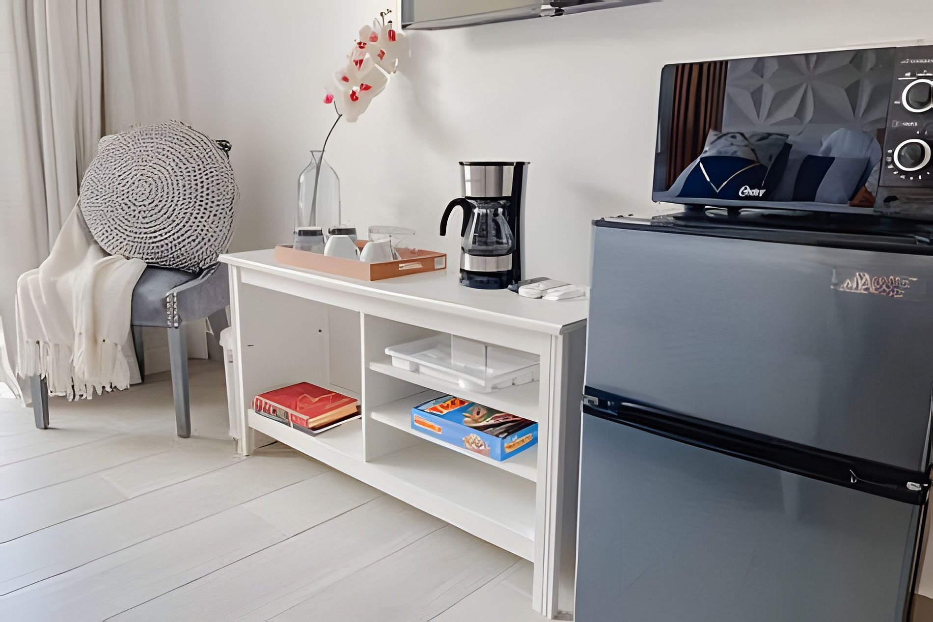 La cocina presenta un diseño moderno y está equipada con una amplia nevera, estufa, horno, microondas, cafetera y más.