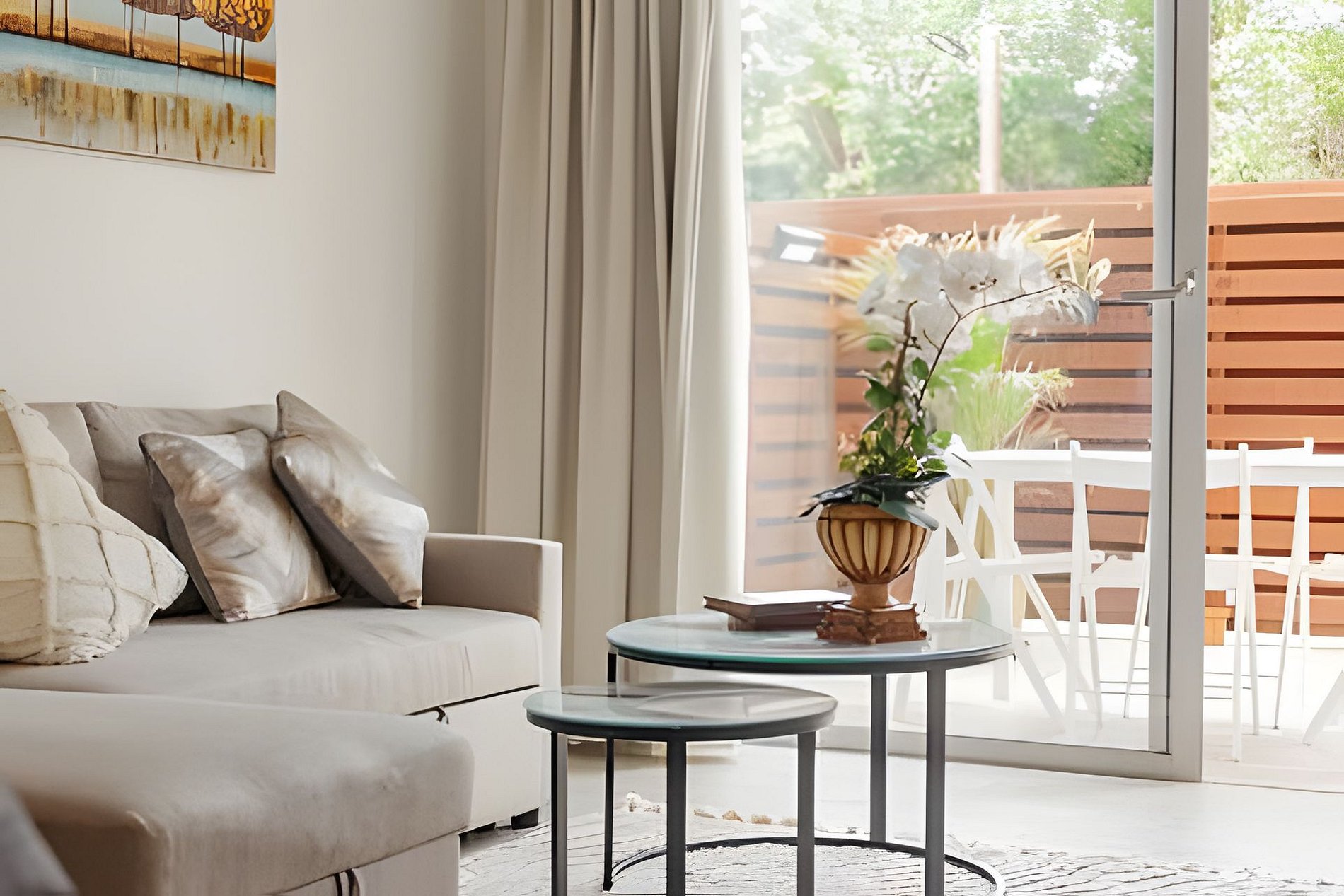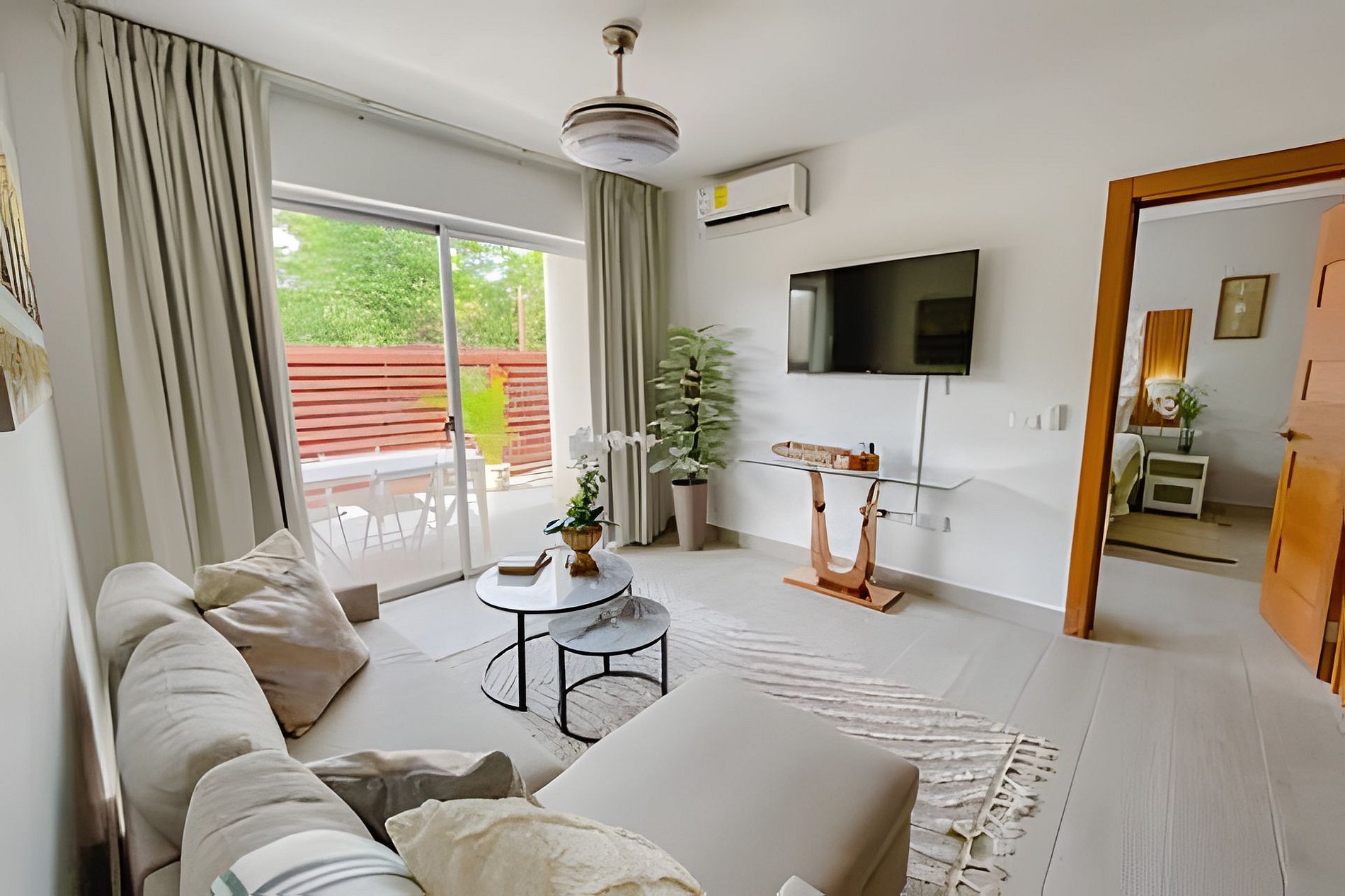 El salón cuenta con un cómodo sofá cama, smart TV, ventilador de techo y aire acondicionado. También tiene acceso directo al balcón.
