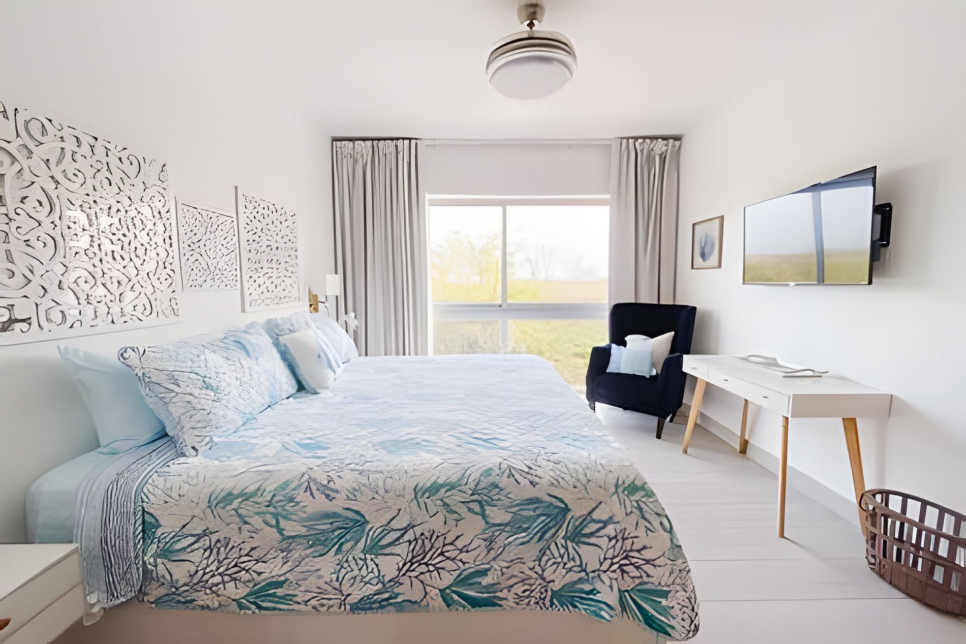 DORMITORIO 1 El dormitorio 1 tiene una acogedora cama Queen, un televisor inteligente, un ventilador de techo, aire acondicionado y un baño privado con ducha a ras de suelo.