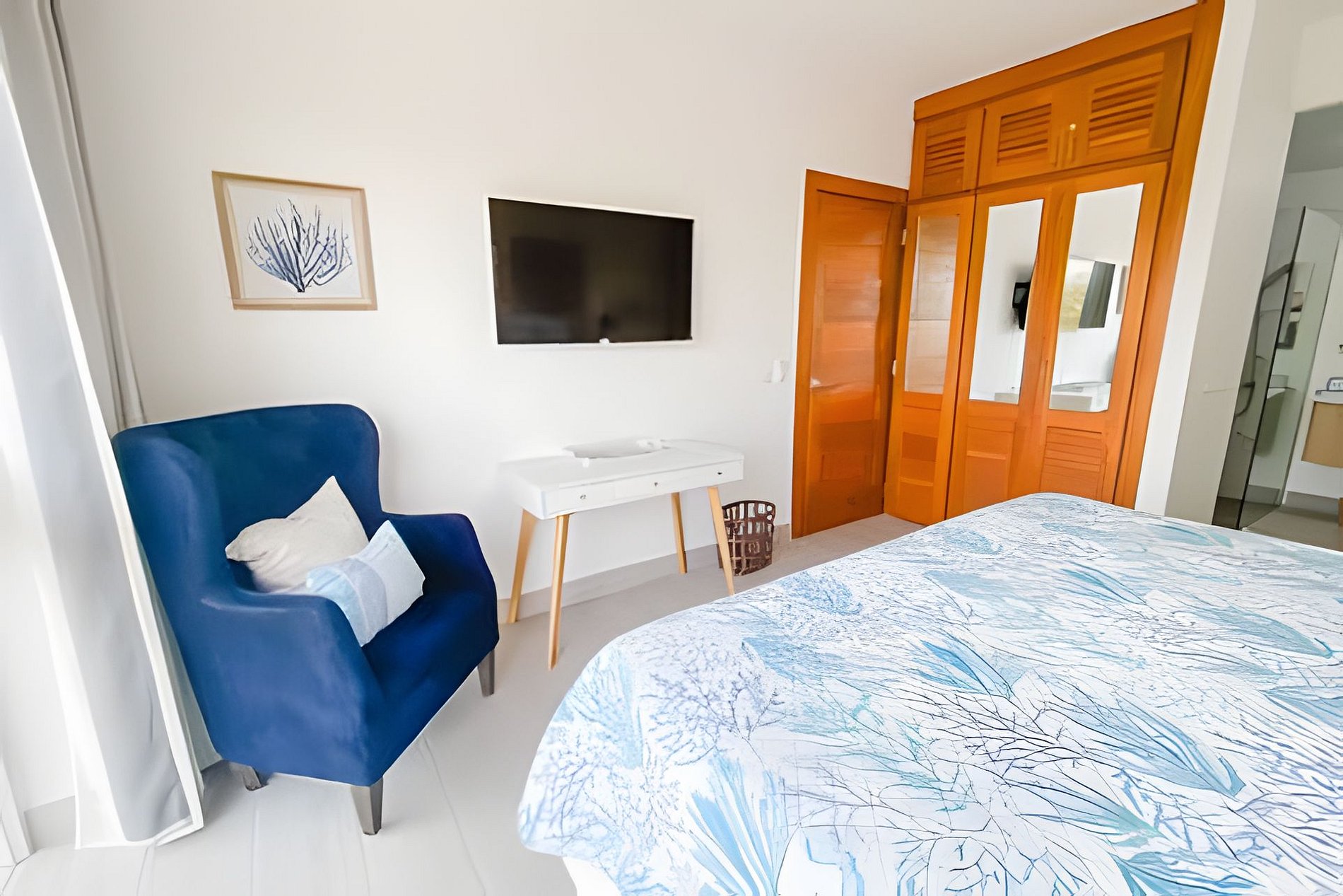 DORMITORIO 2: El segundo dormitorio cuenta con una cama tamaño Queen, un televisor inteligente, aire acondicionado y una pequeña cocina con una pequeña nevera y cafetera. Además, cuenta con un baño privado para mayor privacidad y comodidad.
