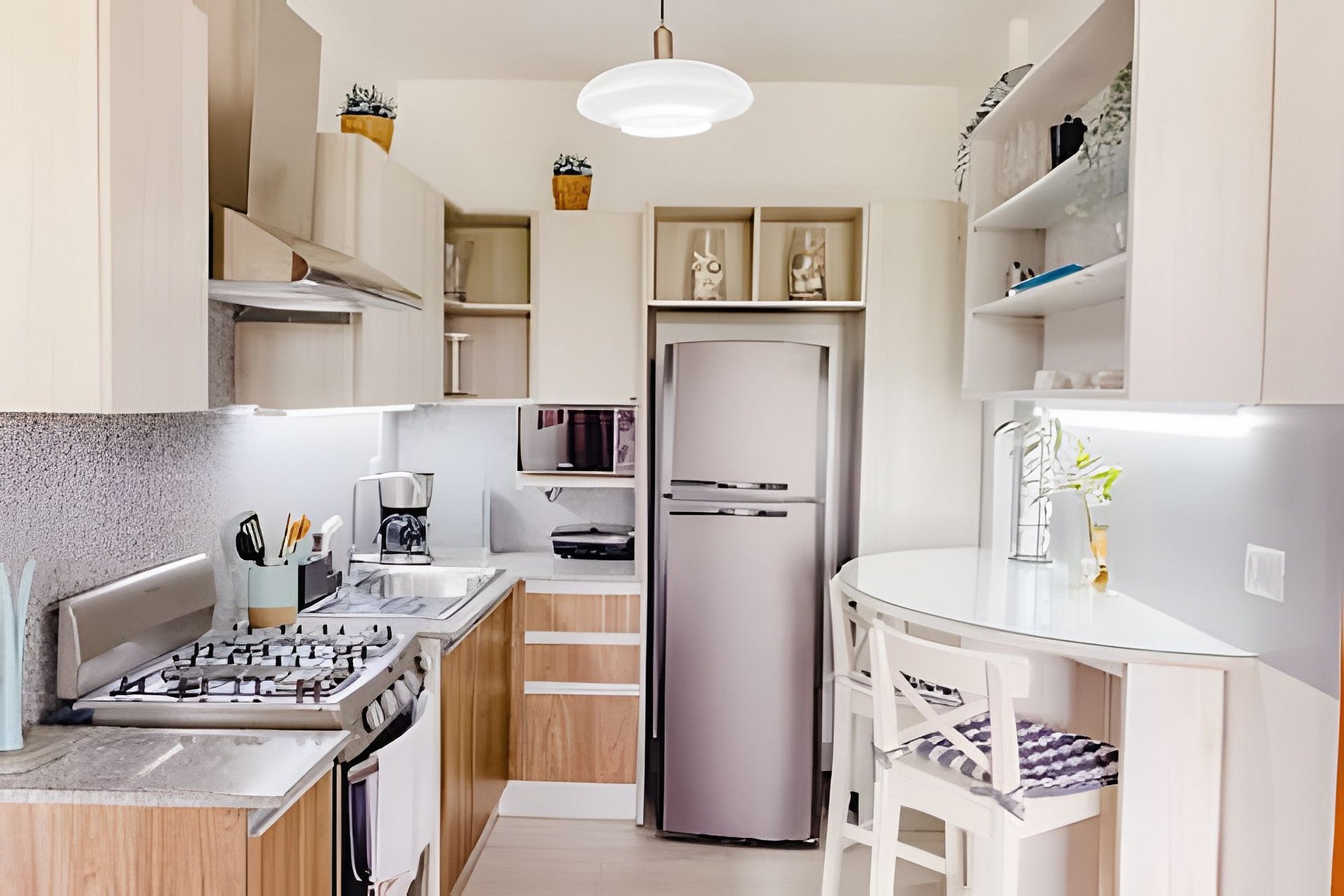 La cocina tiene un diseño moderno y está equipada con una amplia nevera, estufa, horno, microondas, cafetera y más.